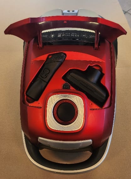 Drobné příslušenství (štěrbinovou a polštářovou hubici, kartáček) snadno uložíte do prostoru přímo v těle vysavače. S marným hledáním je tak konec.