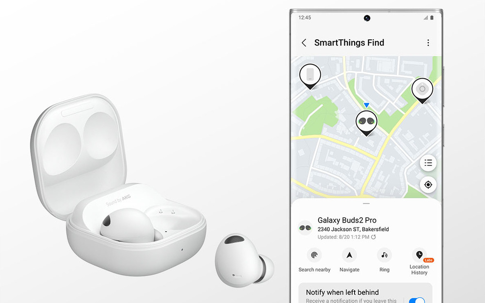 Přes důmyslný lokátor v aplikaci SmartThings Find sluchátka vždy hravě najdete – a to i v případě, že zrovna nejsou v pouzdře. Navíc se nemusíte obávat, že je někde zapomenete – pokud se vzdálíte, mohou vás upozornit vestavěným alarmem a notifikací na telefonu.